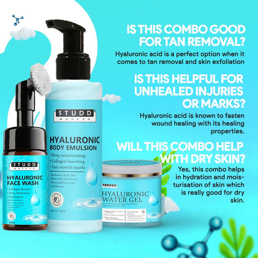 Studd Muffyn Hyaluronic Face and Body Combo- Hyaluronic Gel (100 Gram), Hyaluronic Foaming Face Wash (100 ml) and Hyaluronic Body Emulsion (100ml)